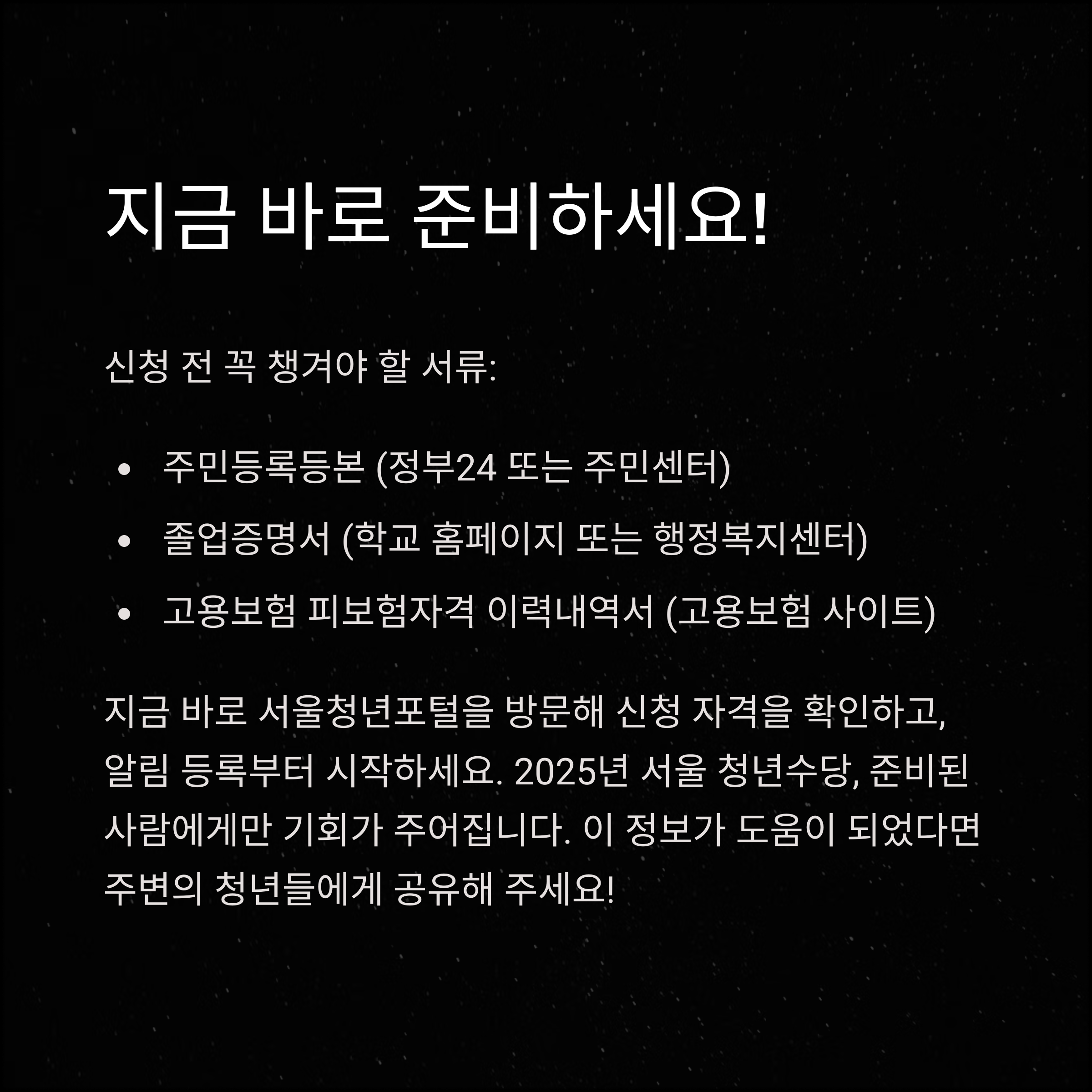 지금 바로 서울청년포털을 방문해 신청 자격을 확인하고, 알림 등록부터 시작하세요. 2025년 서울 청년수당, 준비된 사람에게만 기회가 주어집니다.
