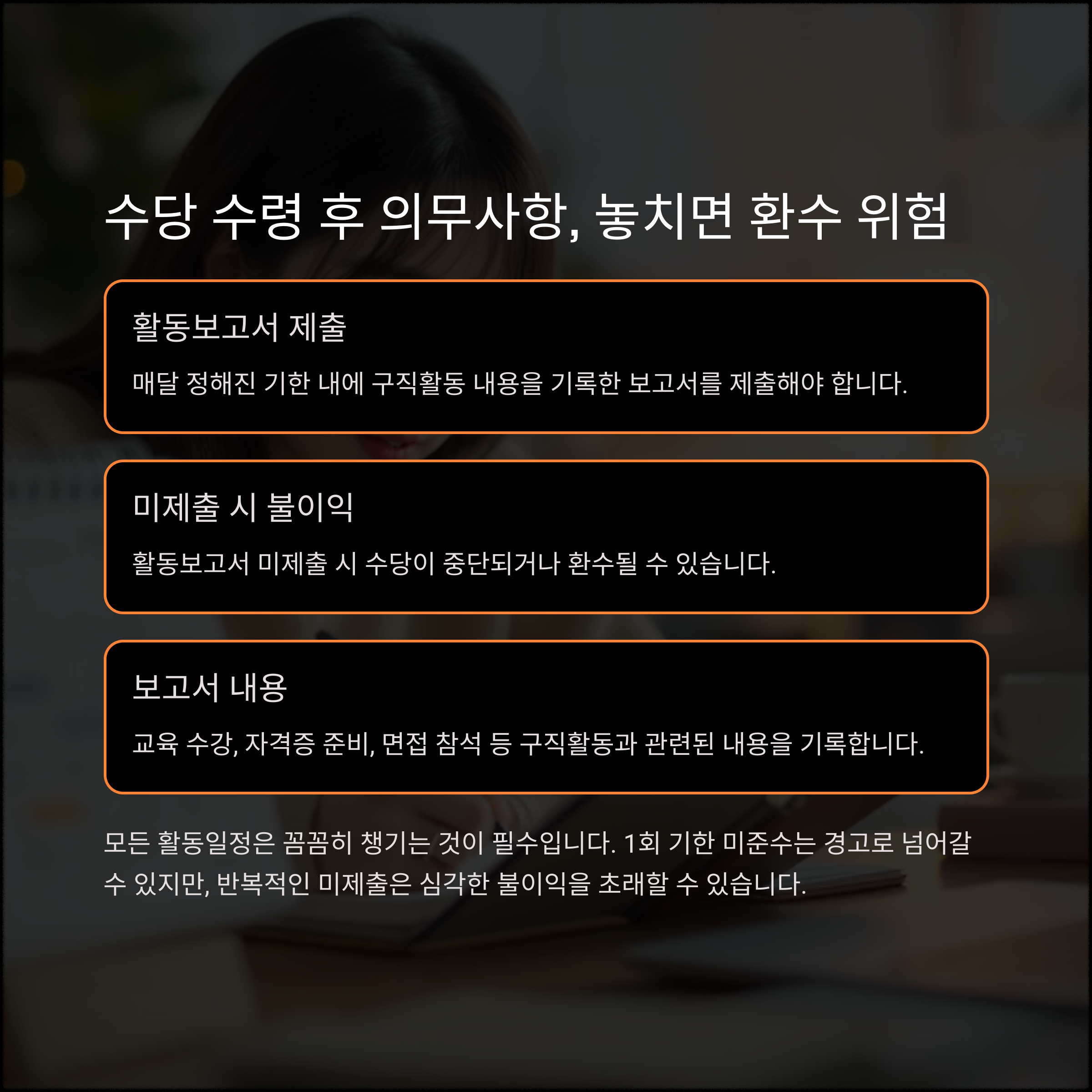 청년수당을 받게 되면, 매달 정해진 기한 내에 활동보고서를 제출해야 하며, 미제출 시 수당이 중단되거나 환수될 수 있습니다.