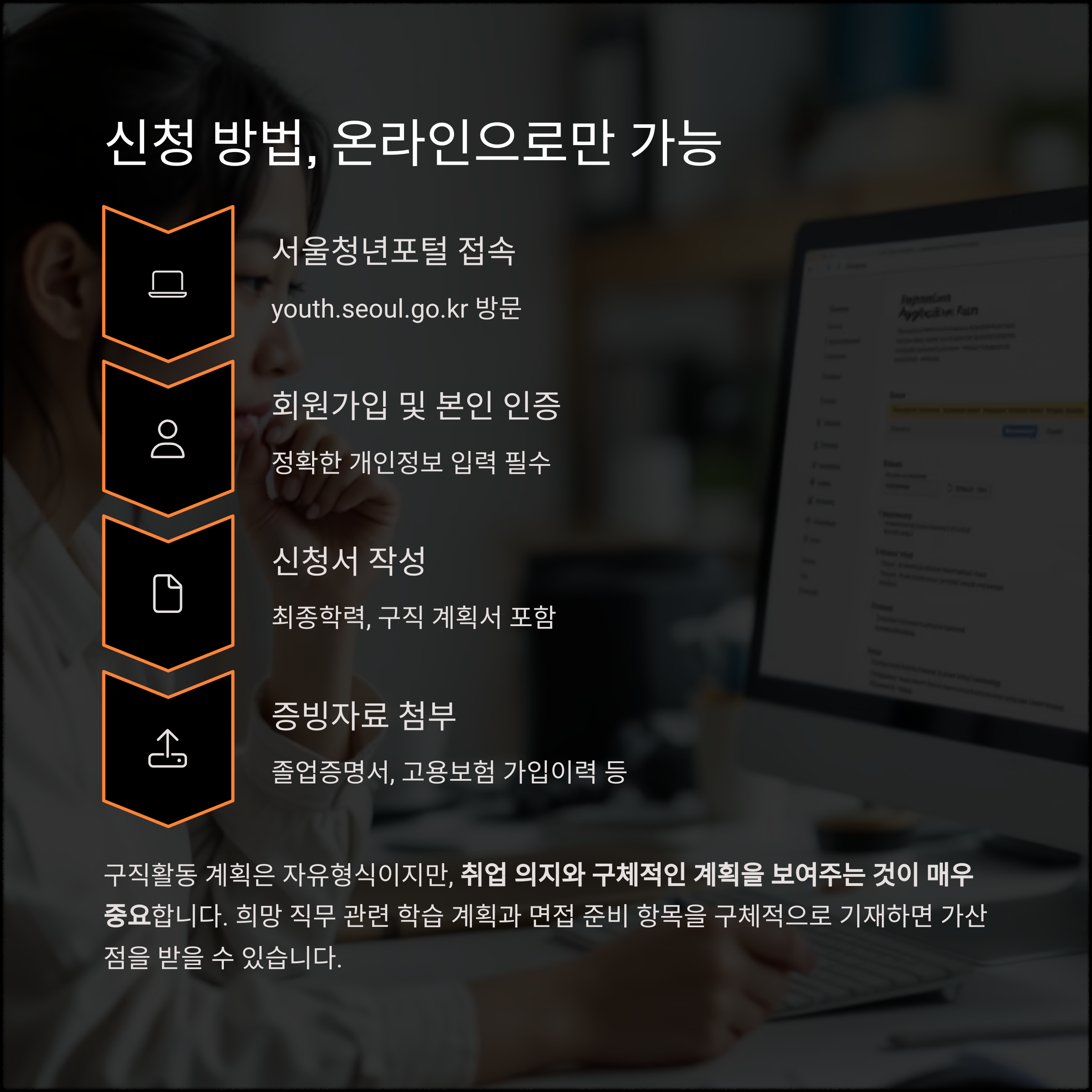 서울 청년수당은 오프라인 접수가 불가능하며, 반드시 서울청년포털을 통해 온라인으로만 신청해야 합니다.