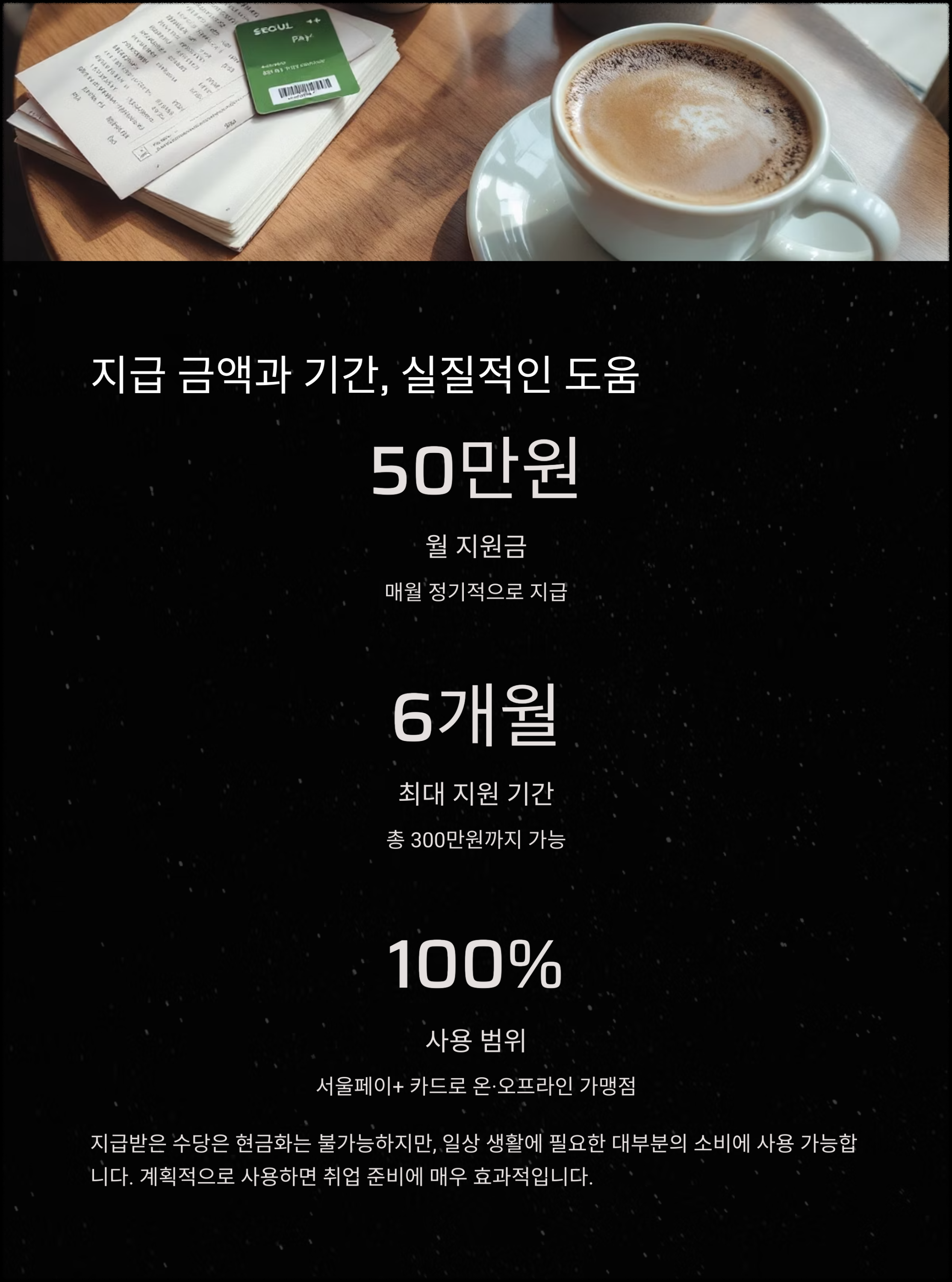 핵심: 지급받은 수당은 현금화는 불가능하지만, 일상 생활에 필요한 대부분의 소비에 사용 가능하므로 계획적으로 사용하면 취업 준비에 매우 효과적입니다.