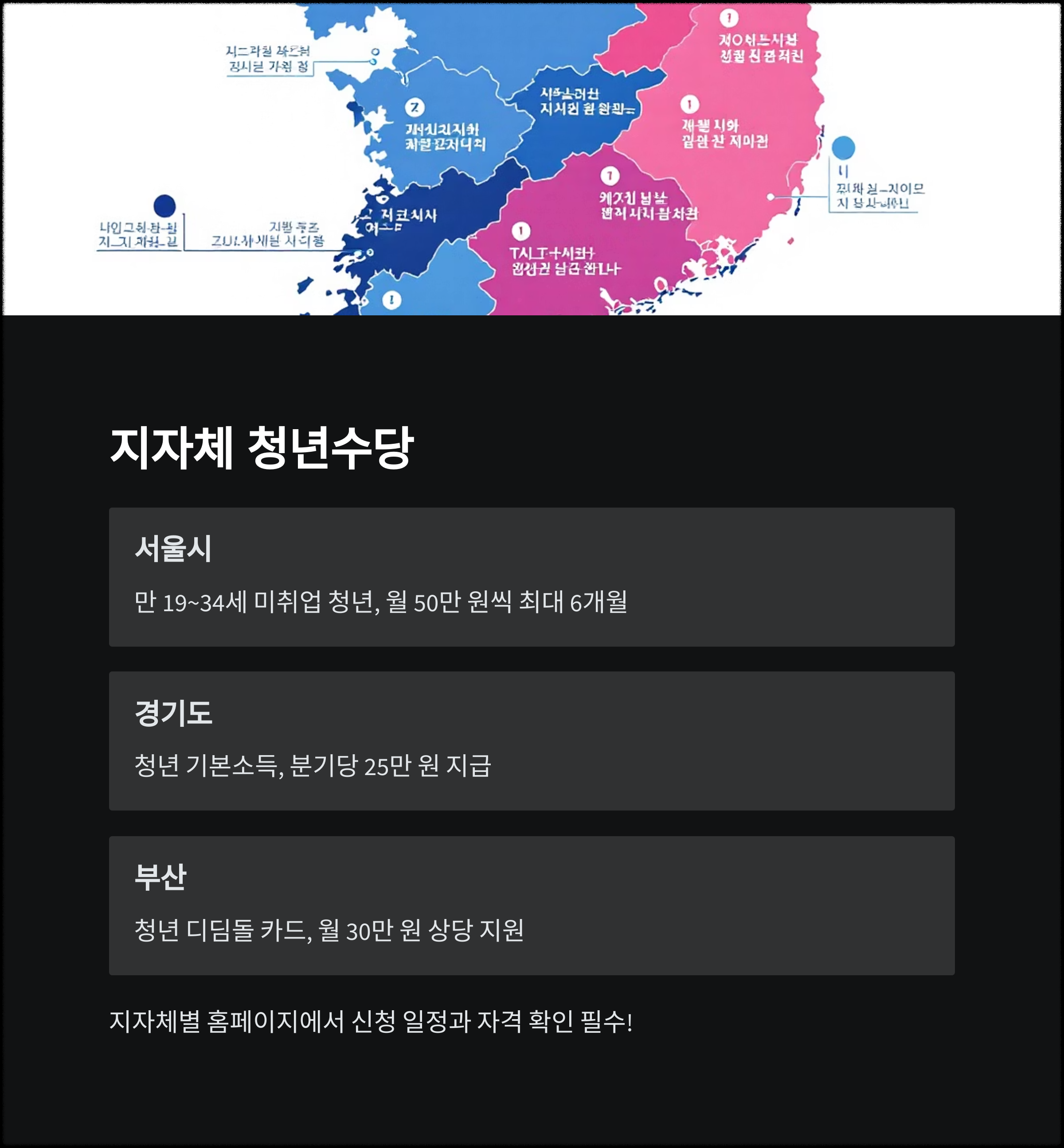 서울, 경기, 부산 등 주요 지자체에서는 지역 청년을 위한 청년수당 제도를 따로 운영합니다.