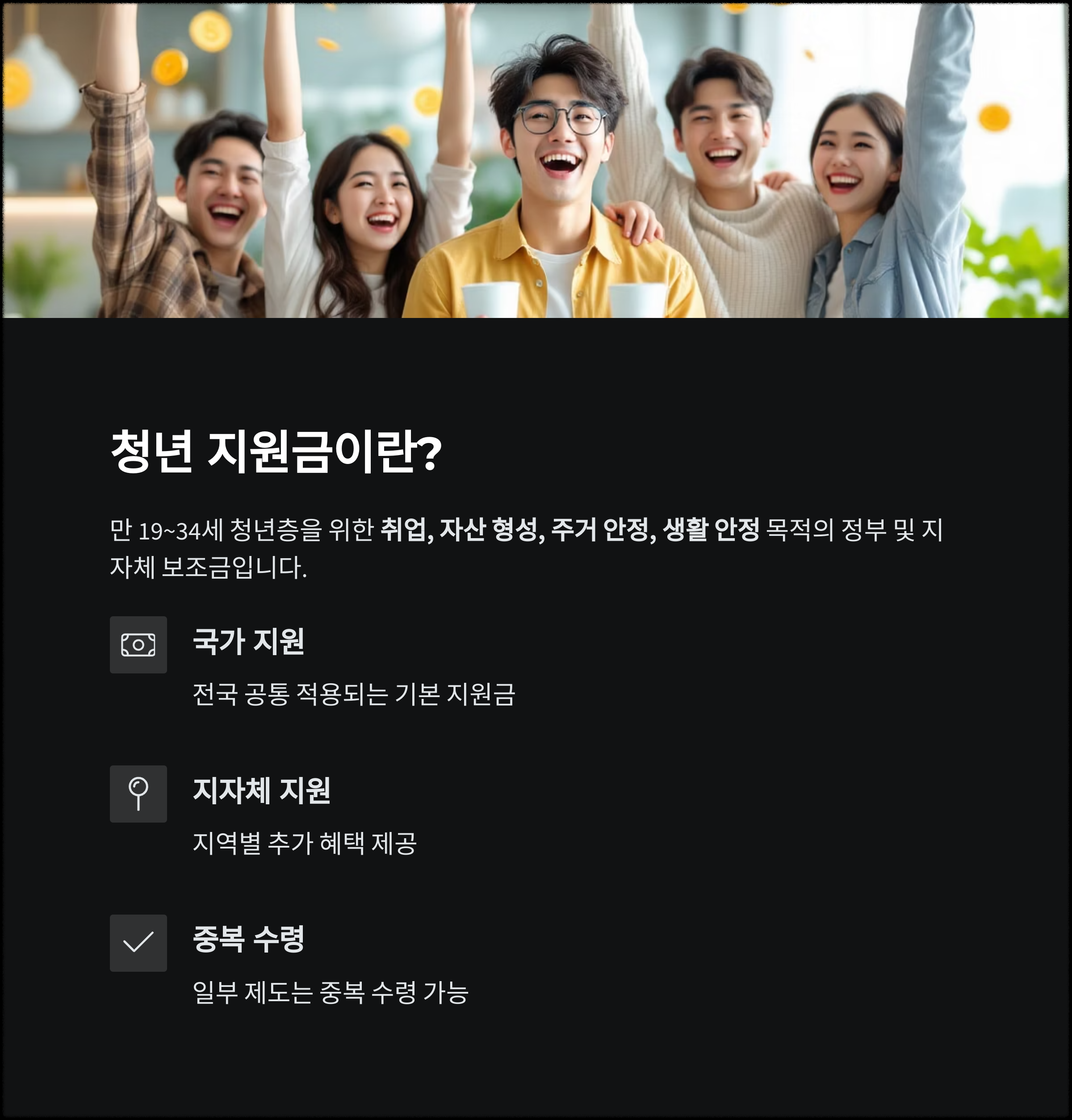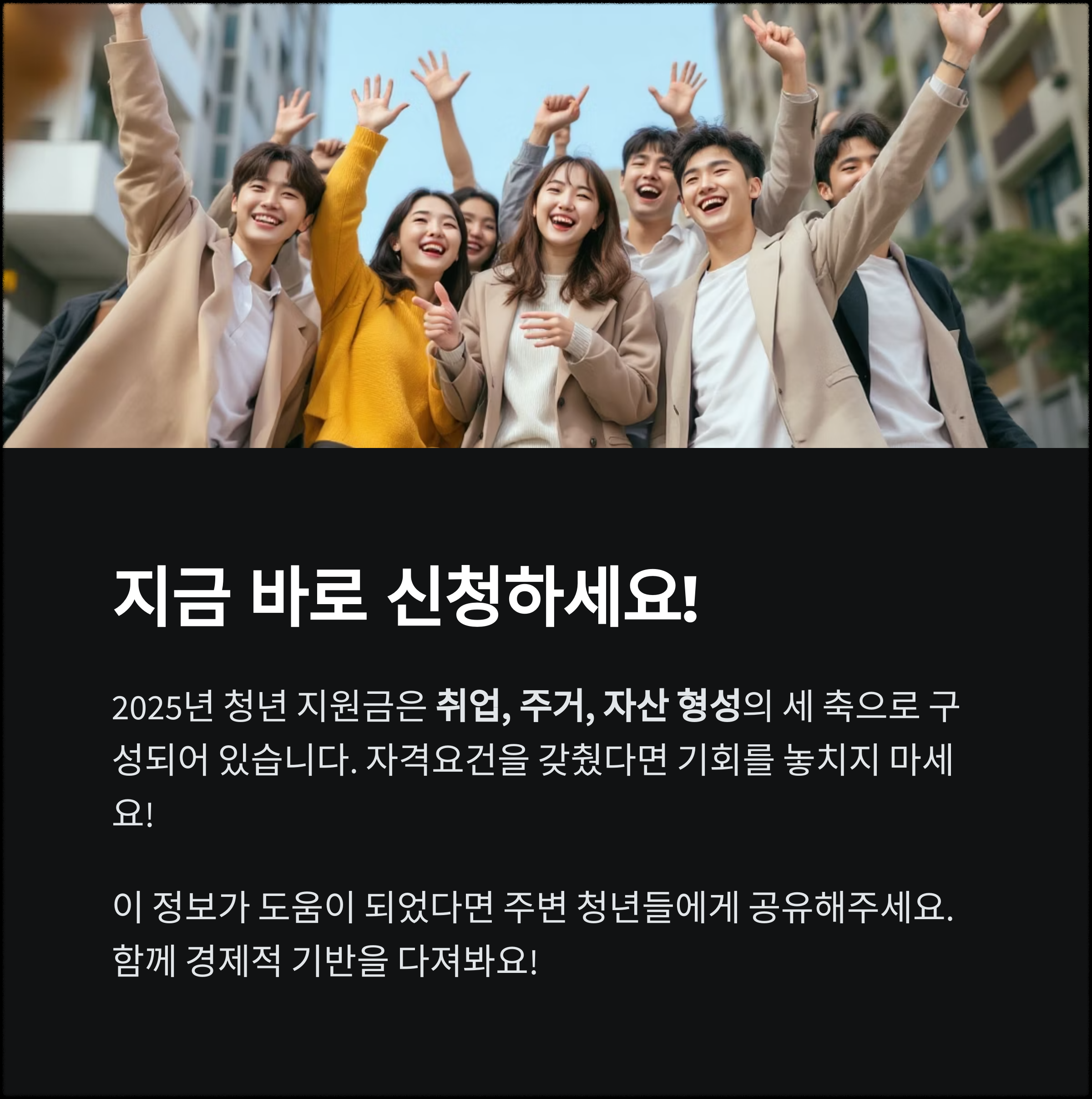 2025년 청년 지원금은 취업, 주거, 자산 형성의 세 축으로 구성되어 있습니다.