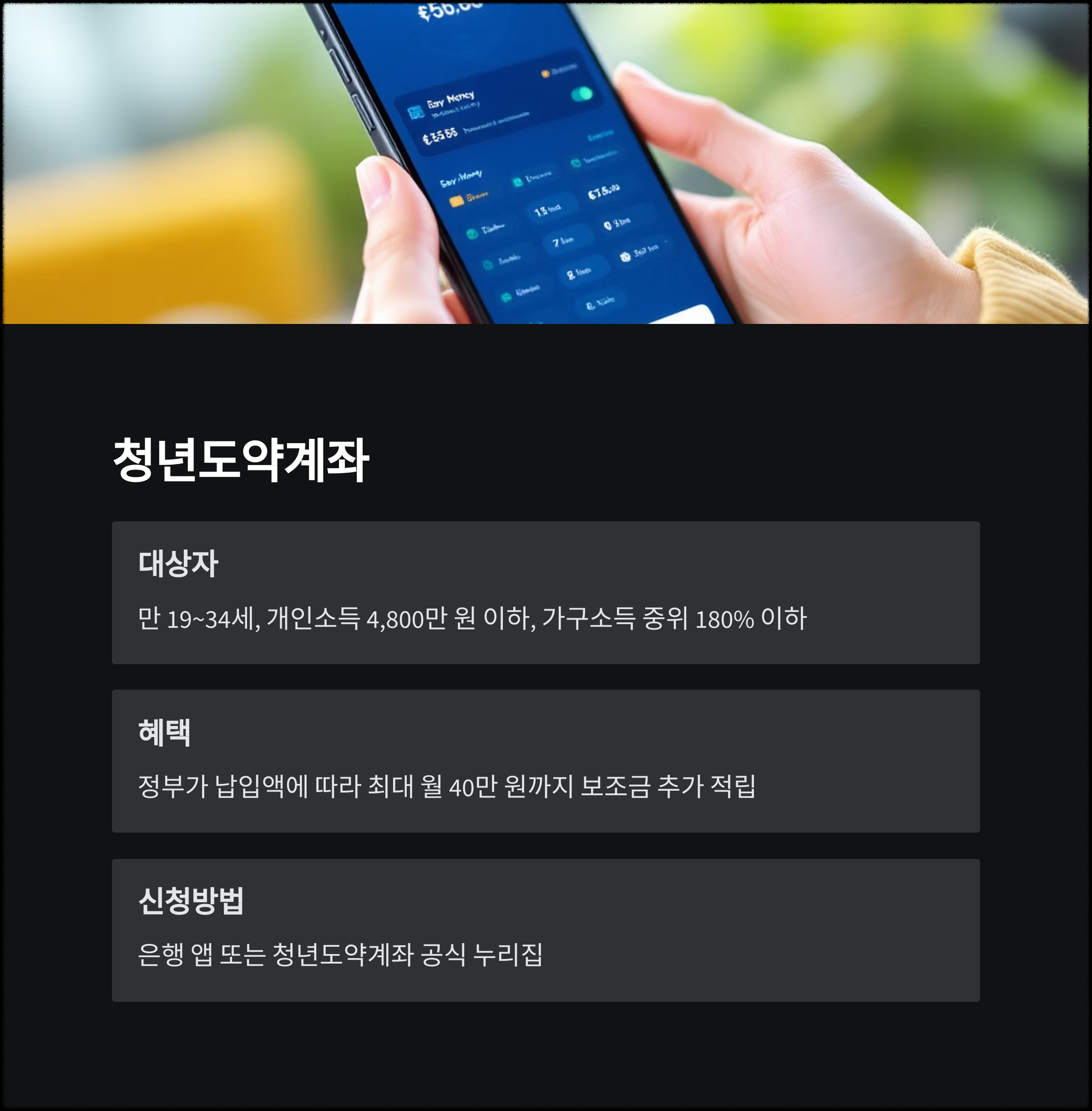 | 청년내일저축계좌 | 저소득 청년 자산 지원 | 최대 3년간 1,440만 원 |