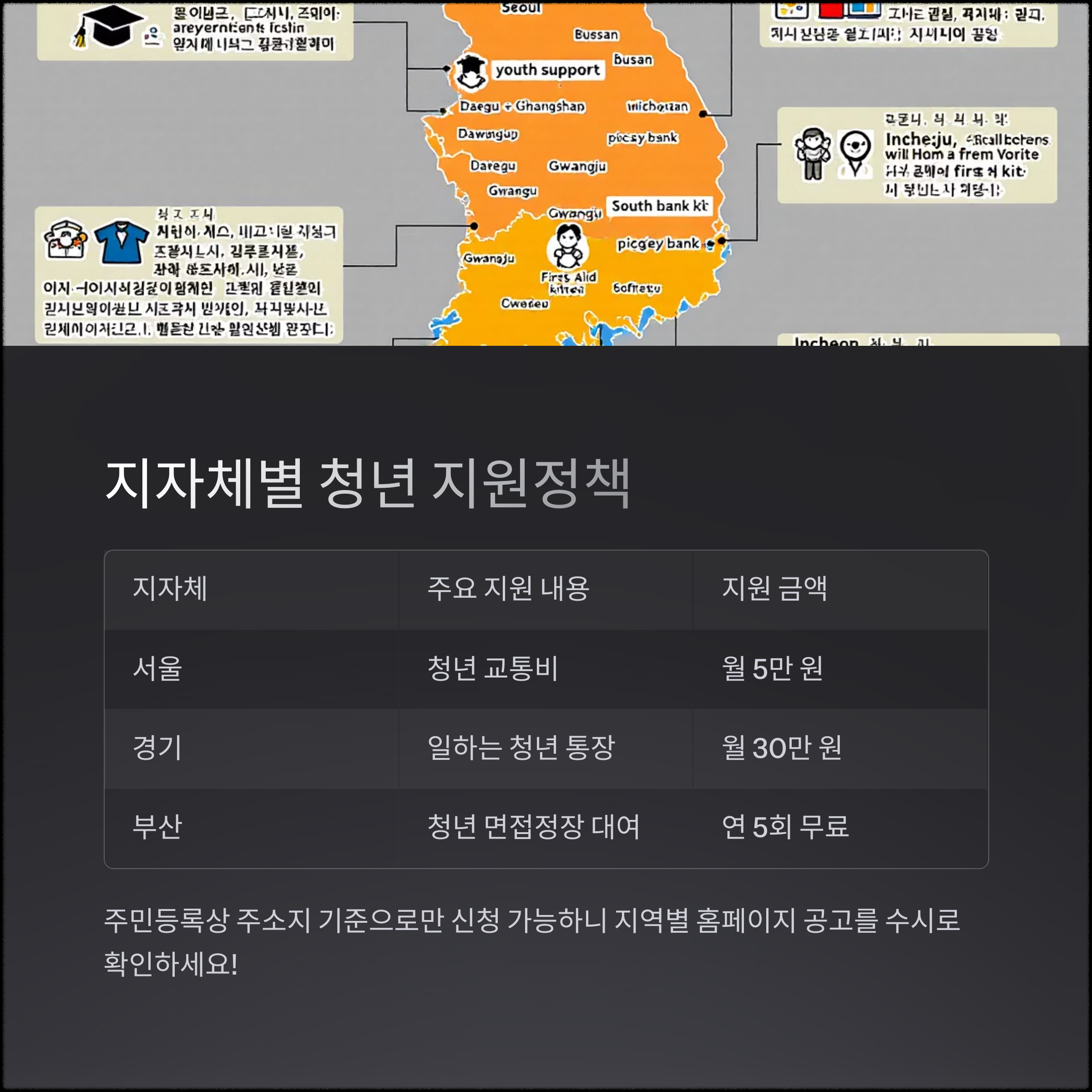 서울, 경기, 부산 등 각 지역별 지자체에서는 교통비 지원, 면접 정장 대여, 창업자금 지원 등 다양한 자체 정책도 시행 중입니다.