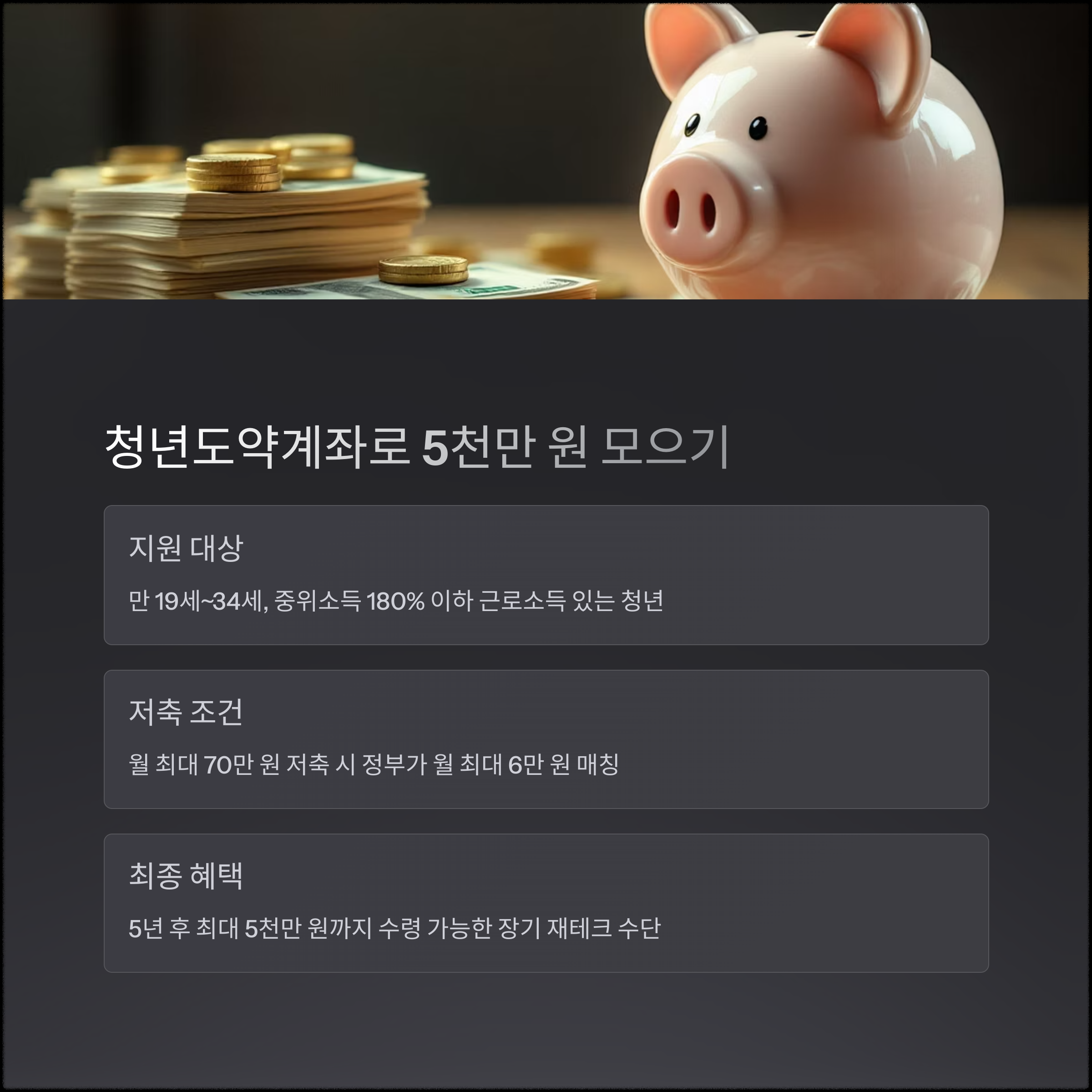 매달 70만 원까지 저축하면 정부가 최대 4만 원~6만 원까지 추가 지원, 5년 후 최대 5천만 원까지 수령 가능하며, 근로소득이 있는 만 19세~34세 청년이 대상입니다.