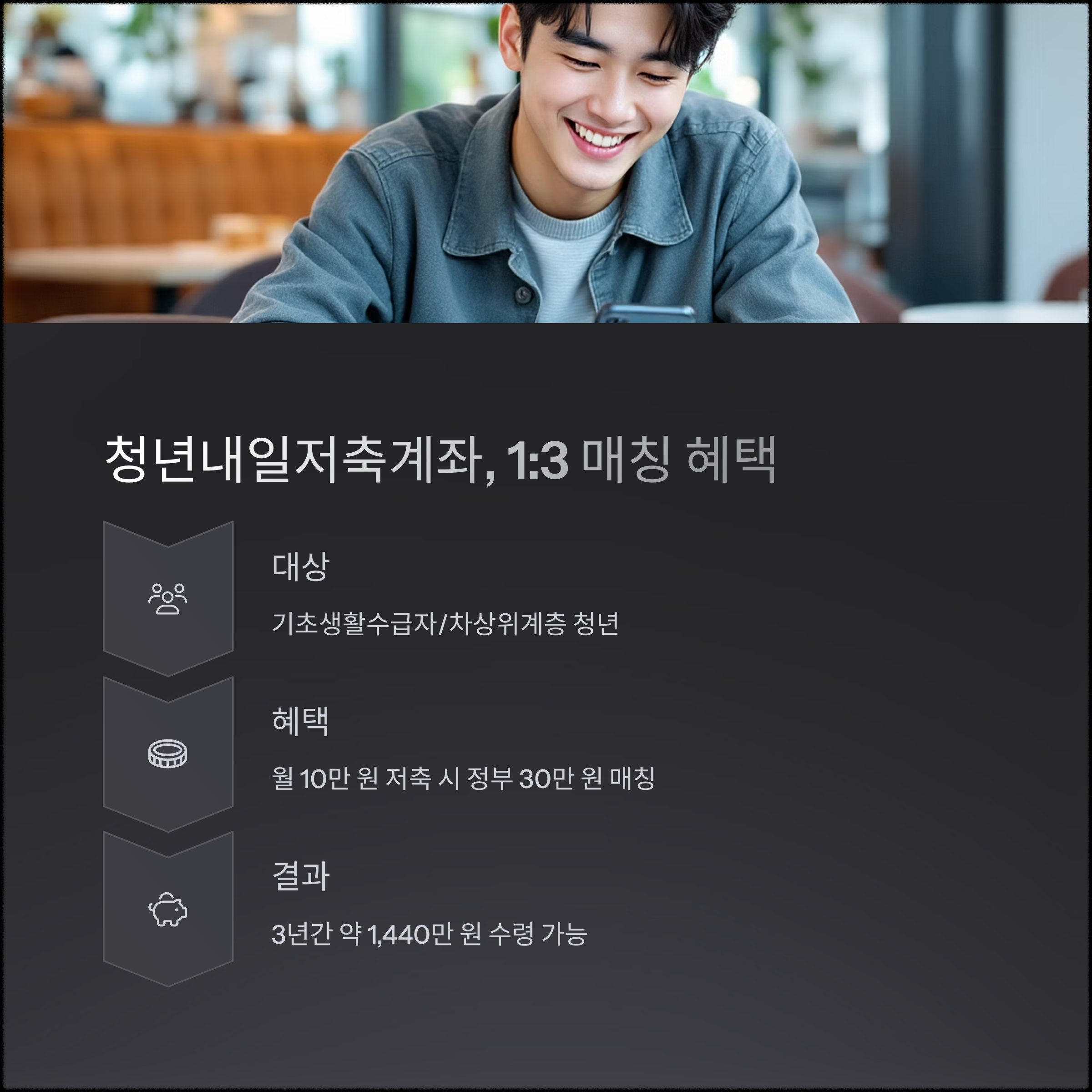 본인이 매달 10만 원을 저축하면 정부가 30만 원을 매칭, 총 3년간 약 1,440만 원을 수령할 수 있습니다.
