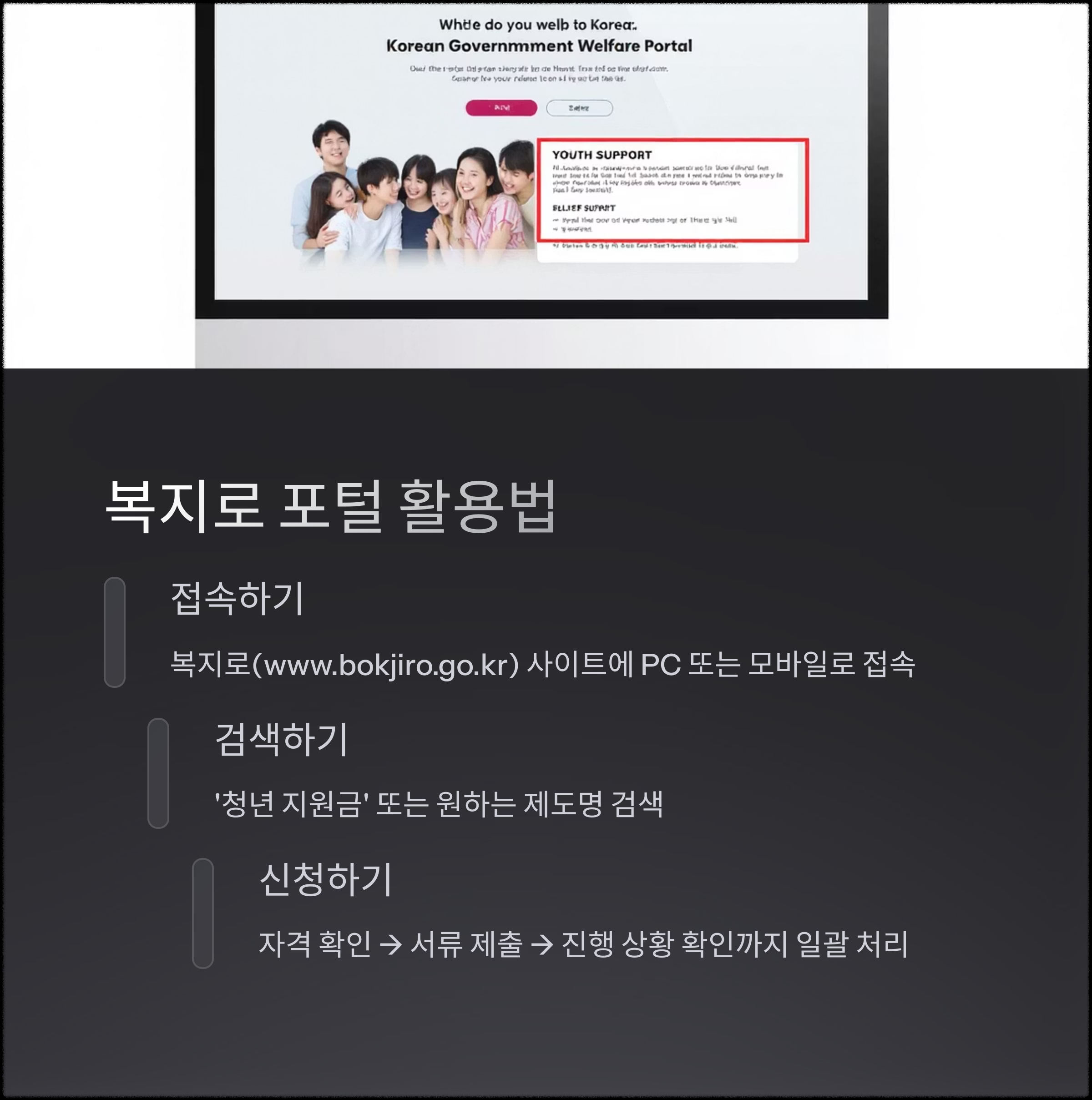 복지로(www.bokjiro.go.kr)는 대부분의 청년 지원금을 한 번에 검색하고 신청할 수 있는 플랫폼으로 2025년부터 통합 신청 기능이 대폭 강화되었습니다.