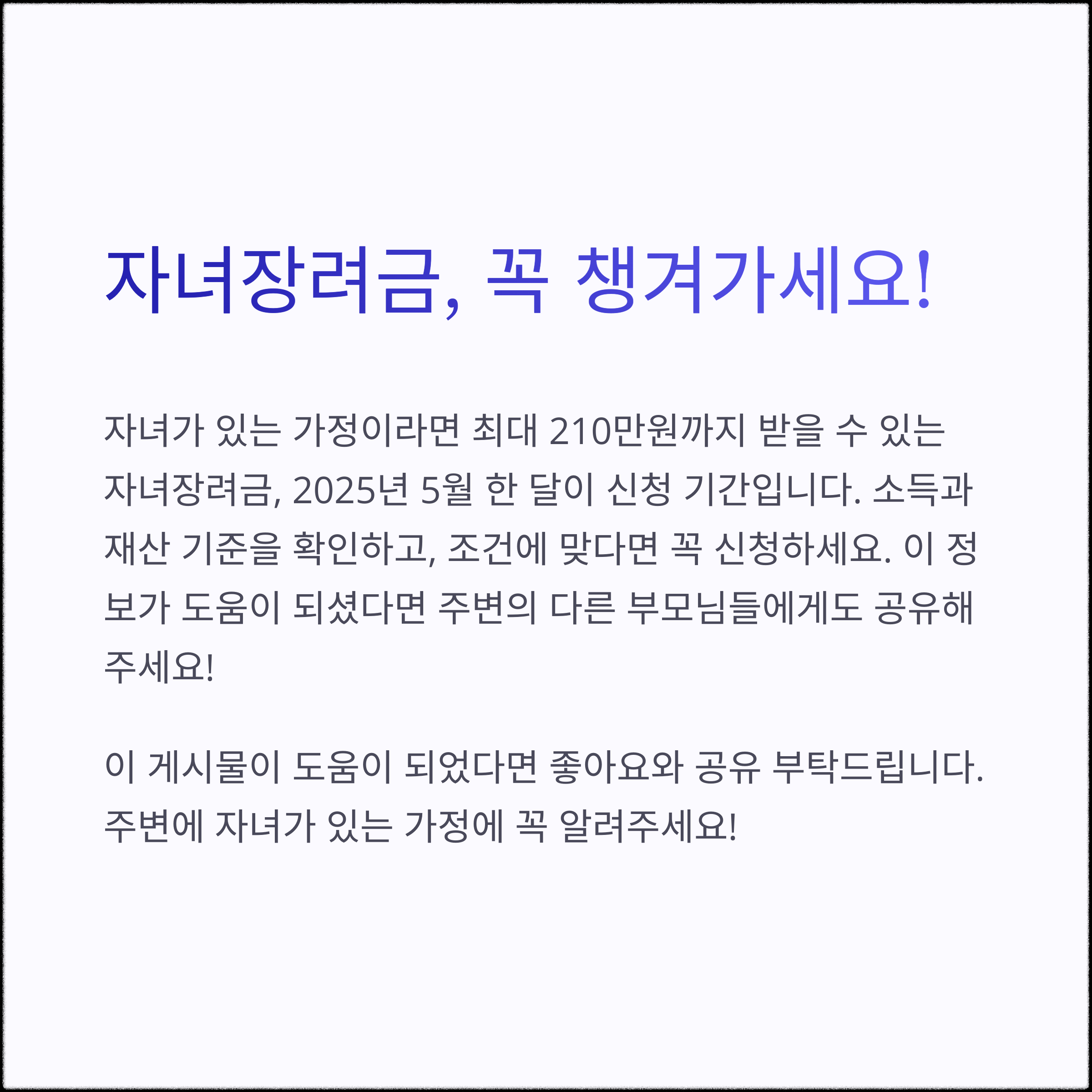 이번 글에서는 2025년 자녀장려금 신청자격부터 신청기간, 소득·재산 기준까지 정확하고 핵심적인 정보만 정리해 드리겠습니다.