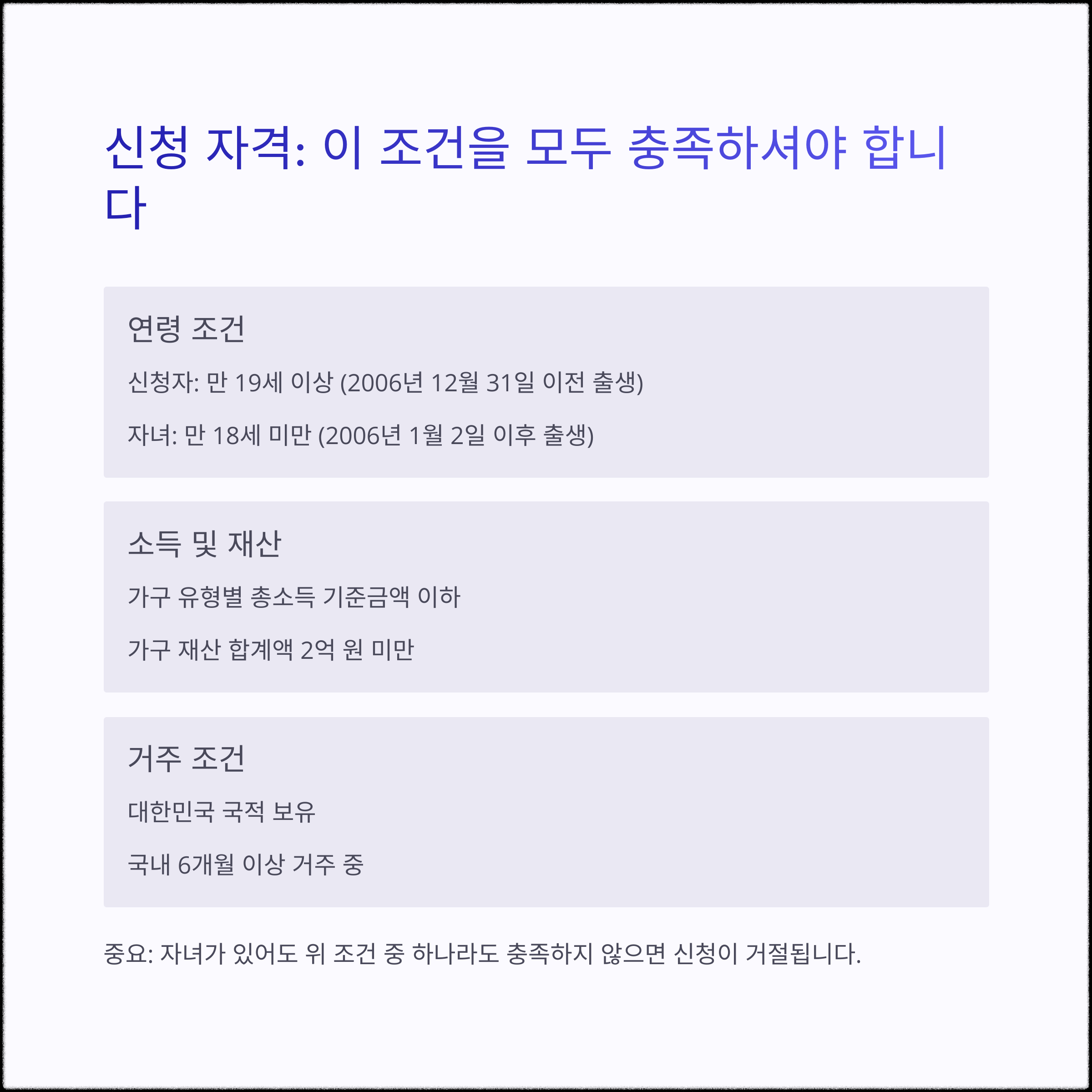 중요: 자녀가 있어도 위 조건 중 하나라도 충족하지 않으면 신청이 거절됩니다.