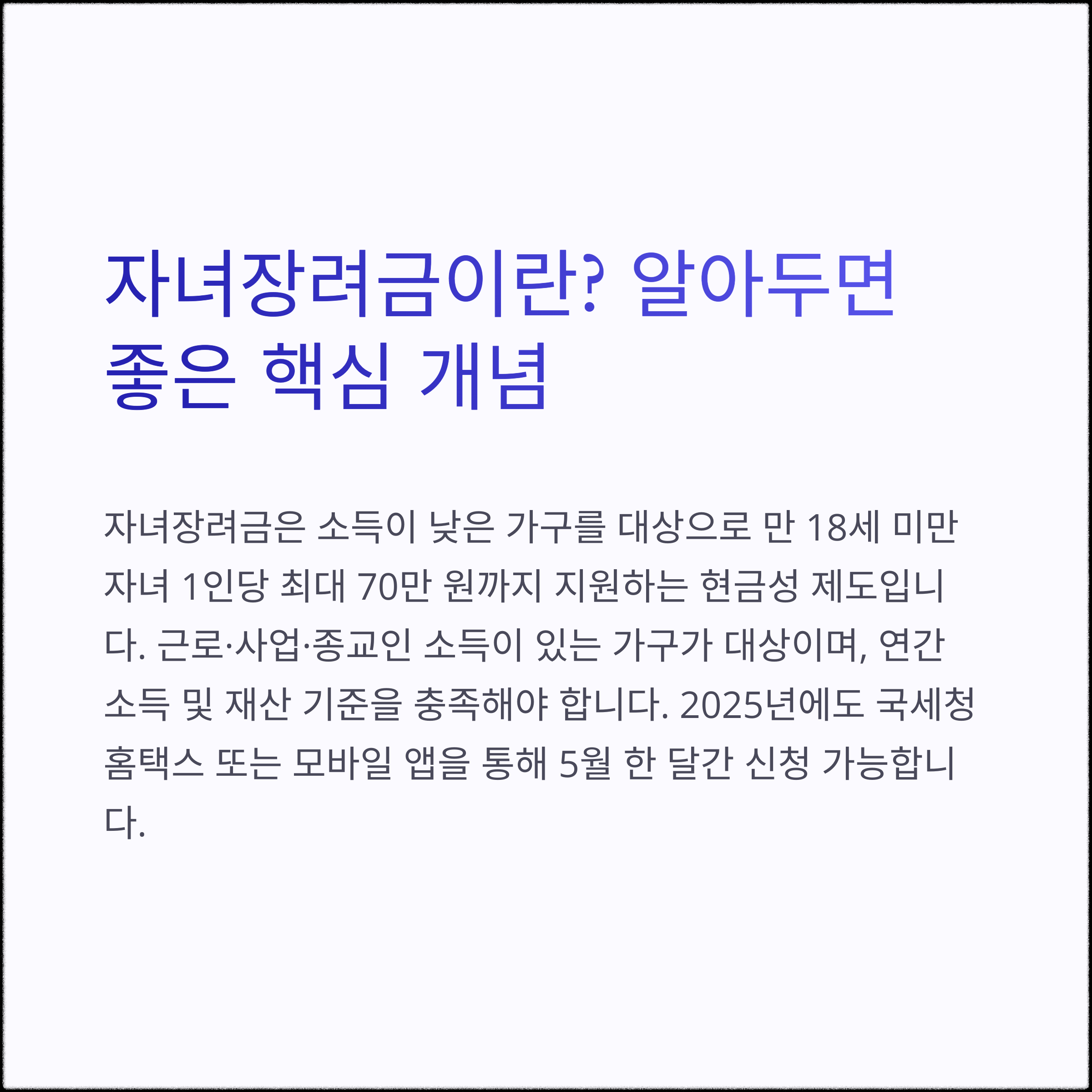 자녀장려금은 소득이 낮은 가구를 대상으로 만 18세 미만 자녀 1인당 최대 70만 원까지 지원하는 현금성 제도입니다.