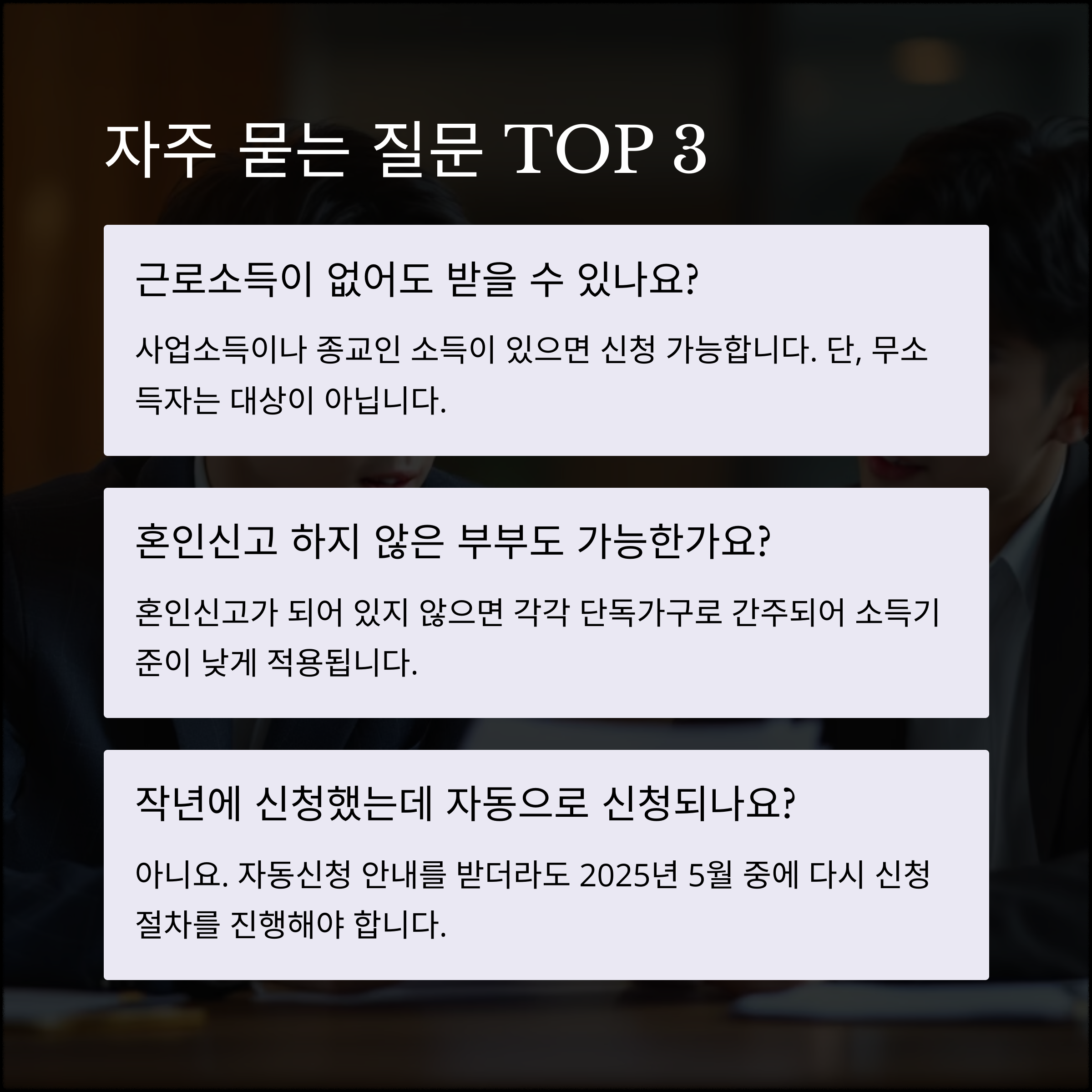 → 사업소득이나 종교인 소득이 있으면 신청 가능합니다. 단, 무소득자는 대상이 아닙니다.