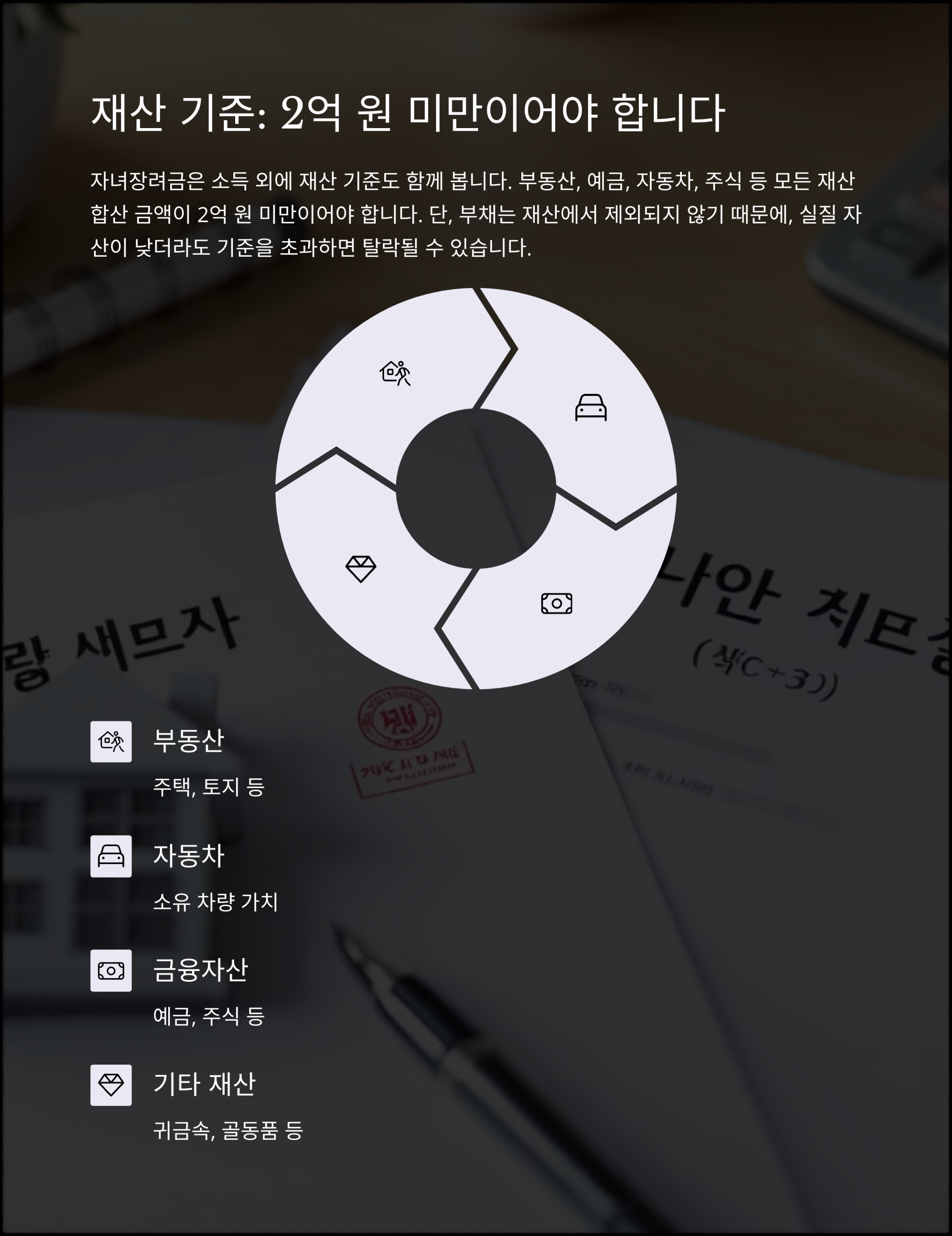 단, 부채는 재산에서 제외되지 않기 때문에, 실질 자산이 낮더라도 기준을 초과하면 탈락될 수 있습니다.